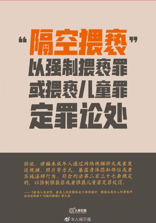 25日,两高联合发布司法解释。其中,两高对隔空猥亵发布司法解释,以强制猥亵罪或猥亵儿童罪定罪论处;精神发育迟滞未成年怀孕可直接立案…戳↓↓每一个孩子都要健康快乐成长!
