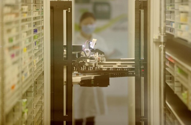 4月2日,浙江省德清县第三人民医院智慧药房发药机器人在配药。新华社发(谢尚国摄)