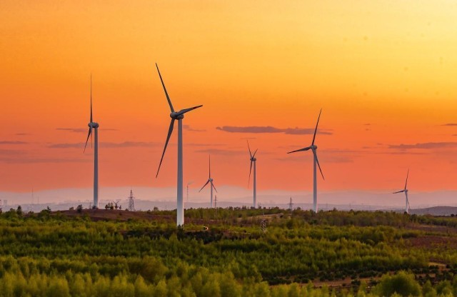 5月23日清晨拍摄的兴安盟乌兰浩特市呼和马场风力光伏发电场内的风机。新华社发(王正摄)