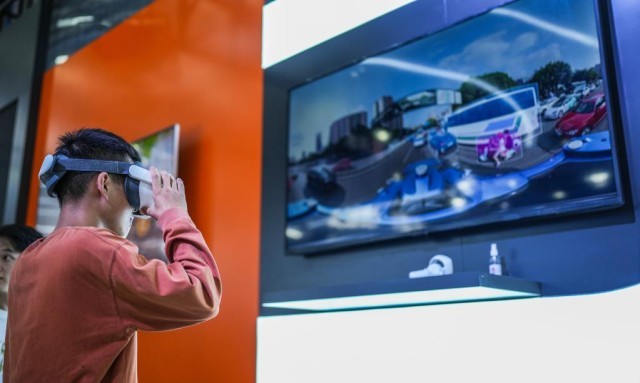 5月26日,参观者在数博会展馆内通过VR设备体验无人驾驶视角。新华社记者 陶亮 摄