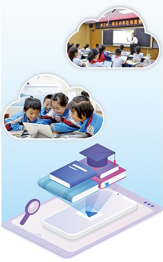图①:青铜峡市第三小学、同乐小学在智慧课堂上同步教学。