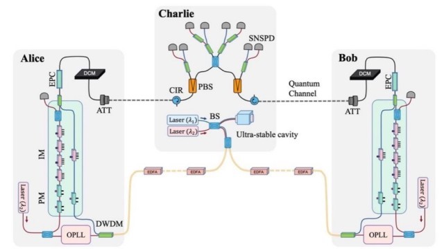 远距离量子密钥分发实验系统原理图。(中国科学技术大学研究团队供图)
