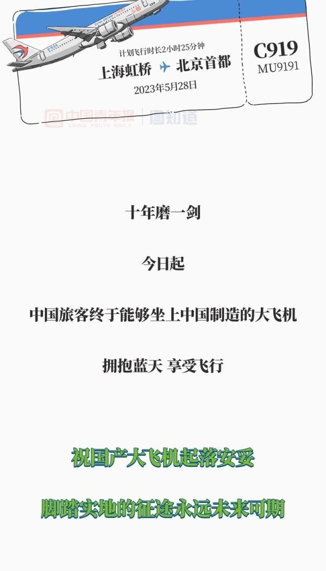 今天上午,东航C919首个商业航班从上海虹桥国际机场起飞,目的地为北京首都国际机场。十六年磨一剑,一步一个脚印,国产大飞机披荆斩棘,终能翱翔蓝天。今日,全新篇章开启,共同祝愿国产大飞机起落安妥!
