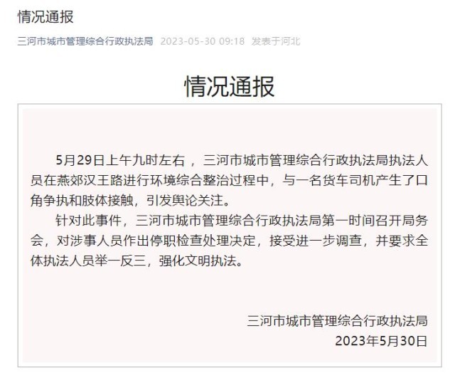 河北三河通报“城管打骂货车司机”:涉事人员停职,接受进一步调查