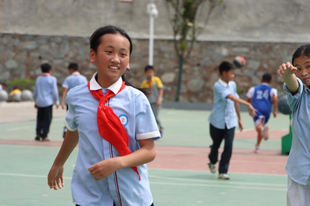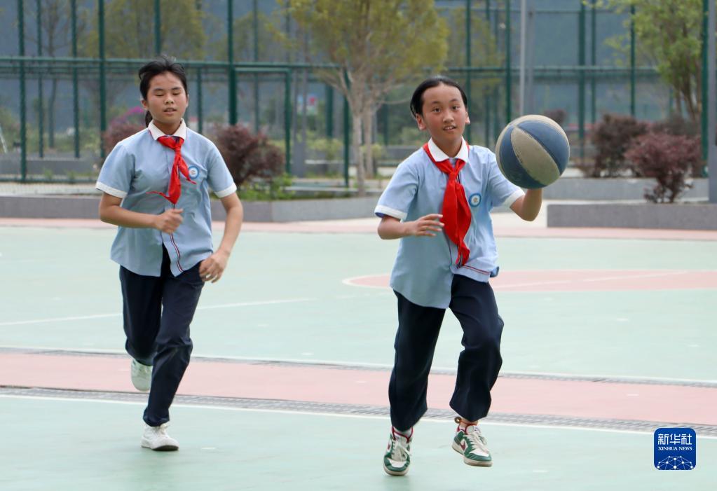 5月30日,贵州省榕江县古州镇第四小学四年级学生杨文源(右)在体育课上和同学一起打篮球。新华社记者 郑明鸿 摄