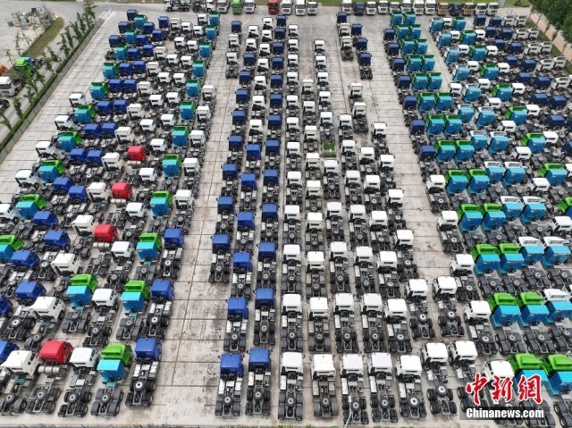 6月2日,航拍山东省济宁市某重型卡车生产基地。(无人机照片)