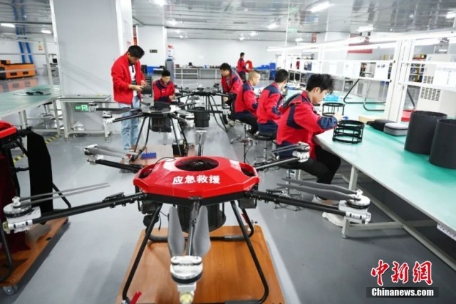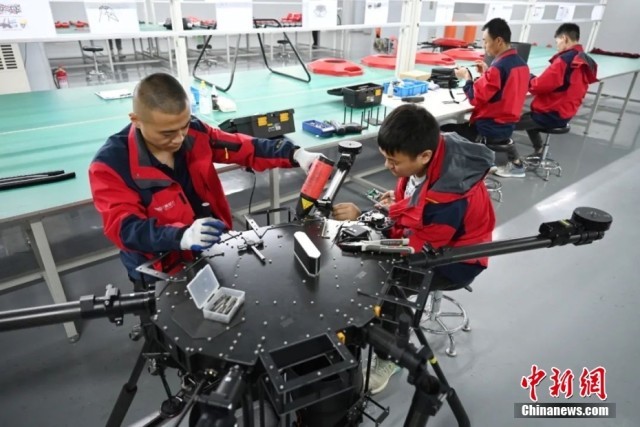 6月2日,山东省济宁市某企业工人在进行应急救援无人机装配作业。(图片来源:中新图片)