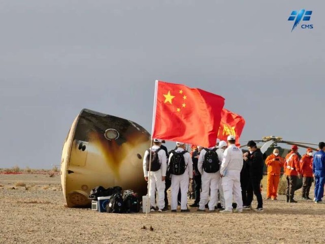 神舟十五号返回舱在预定区域成功着陆,航天员费俊龙、张陆、邓清明,安全健康回到地球家园。中国载人航天工程办公室、酒泉卫星发射中心供图