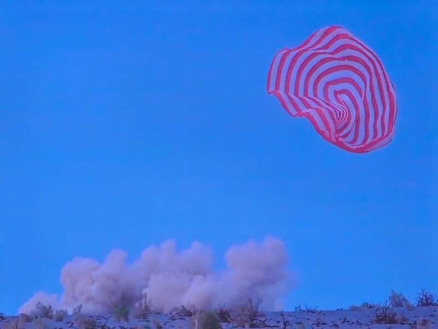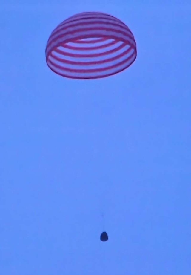 神舟十五号载人飞船返回舱大伞绽放光学影像。张珂森翻拍/酒泉卫星发射中心供图