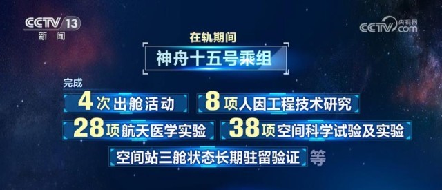 央视网消息:“太空出差”半年,神舟十五号三名航天员的在轨工作非常繁忙,完成了4次出舱活动、8项人因工程技术研究、28项航天医学实验、38项空间科学试验及实验,以及空间站三舱状态长期驻留验证等6个方面的工作,圆满完成了全部既定任务,获取了宝贵的实验数据。