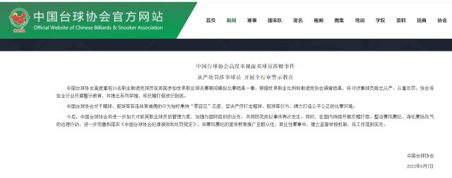 今后,中国台球协会将进一步加大对旅英职业球员的管理力度,加强与国际组织的合作,共同防范类似事件再次发生。同时,在国内持续开展反赌打假、整治赛风赛纪、净化赛场风气的治理行动,进一步完善和落实《中国台球协会纪律准则和处罚规定》,将赛风赛纪的宣传教育推广至群众性、商业性赛事中,建立监督举报机制,将工作落到实处。
