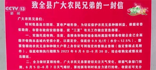 村民李宁敏提到的这封信是兰考县委县政府于6月5日发布的。信中提到,当前,县粮食和物资储备局所属国有粮食收储企业已全面敞开收购县域内受损小麦,以质定价,受损小麦水分不高于12.5%的,保底价0.9元/斤。为了帮助农民减少损失,保护农民种粮积极性,兰考县共设置了63个芽麦收购点,并派出5名工作人员在收购点值守,为农民服务。