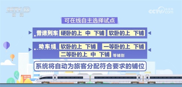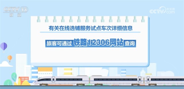 央视网消息:记者从国铁集团获悉,今天(6月10日)起,铁路部门将在12306网站和12306手机客户端试行在线选铺服务。