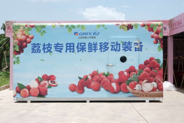 前几天,格力电器自主研发的荔枝专用保鲜移动装备首台机组刚刚下线,已经送达茂名高州投入使用。这个专用移动“大冰箱”的有效容积20平方米,可存放5吨荔枝,适用于荔枝的预冷、存储;可应用于果园、集散地、农村合作社等荔枝产业环节。同时,设备可达到较好的保鲜效果,荔枝存储20天后,好果率达99.8%。