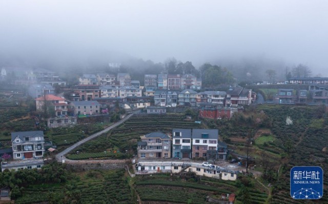 空中俯瞰云雾中的浙江杭州富阳里山镇安顶村(3月23日摄,无人机照片)。安顶村海拔700多米,一年中有200多天可观赏“安顶云海”奇景,当地百姓依托高山云雾茶以及特色乡村旅游产业,走出了一条茶旅融合的新农村共同富裕发展模式。新华社记者 徐昱 摄