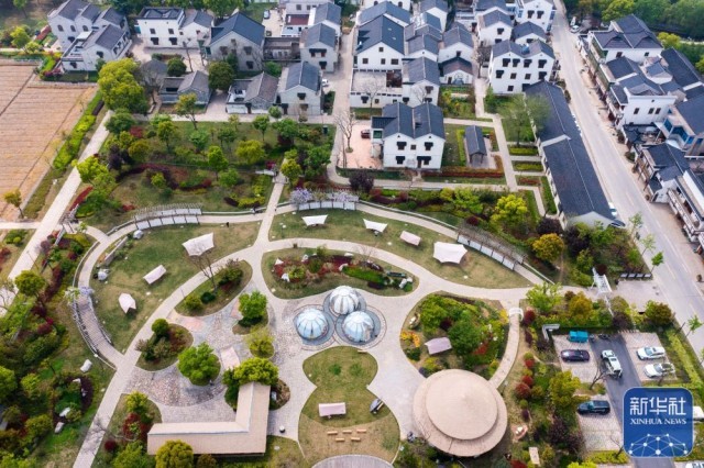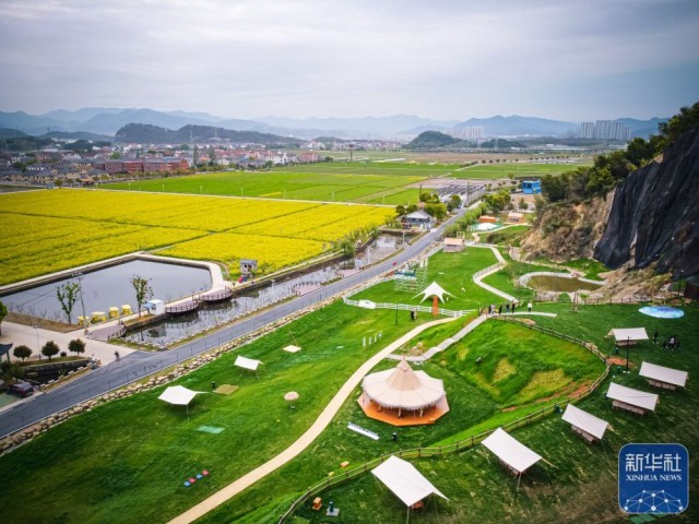 4月11日拍摄的浙江湖州市吴兴区织里镇伍浦村渔耕文化园的陶湾里乡村咖啡店以及乡村露营地(无人机照片)。近年来,湖州市吴兴区织里镇依托当地美丽乡村建设以及自然风光,招引乡贤返乡创业,用闲置民宅、闲置土地建设特色咖啡店、花海景观、特色民宿和农家乐等,做足乡村旅游经济功课。新华社记者 徐昱 摄