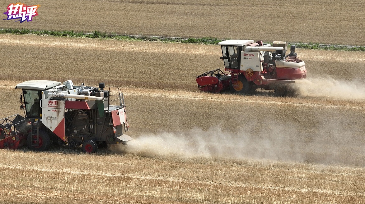 “解决吃饭问题,根本出路在科技。”农机、农技助力抢收,让老百姓更安心。过去,播种、收获、晾晒,都是靠农民面朝黄土背朝天的劳作。如今,全国各地每天不断刷新的麦收进度背后,是各式农机在大展身手。大型收割机马力大、效率高,一天能收上百亩地;履带式收割机更灵活,地块小、有积水、湿度大等情况,都能派上大用场;智能收割机不仅降低小麦抛撒率和破损率,还能让籽粒清洁度达到高品质……今年“三夏”,全国预计有1650万台(套)各类农机投入使用,为颗粒归仓提供坚实支撑。