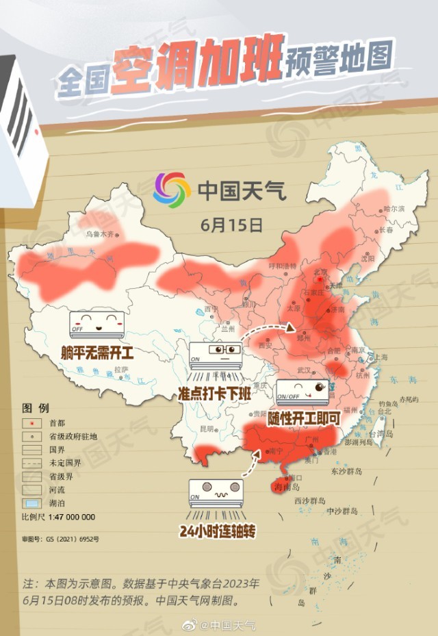 眼下,我国北方今年以来最大范围高温天气仍在持续中,今明两天(6月15日-16日)强度将达到鼎盛,京津冀等7省区市部分地区将出现37℃以上的高温天气,局地甚至会挑战同期最热纪录。江南、华南等地虽没有高温天气,但体感也相当闷热。@中国天气 特别推出全国空调加班预警地图,看哪里的空调需要24小时连轴转。