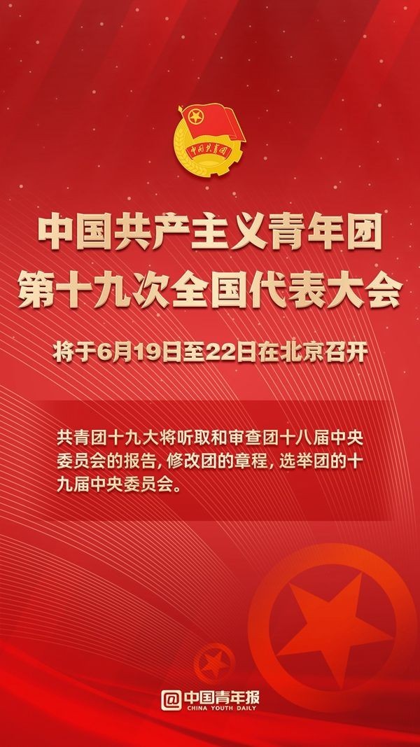 中国共产主义青年团第十九次全国代表大会将于6月19日至22日在北京召开