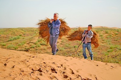 甘肃武威,八步沙林场的治沙人在背草压沙。新华社发