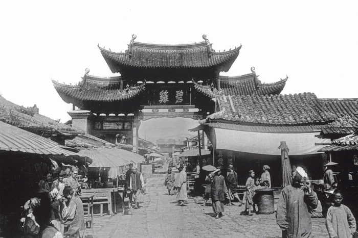 清朝末年昆明金马坊在一众建筑中“鹤立鸡群”,如今却被高楼大厦环抱。