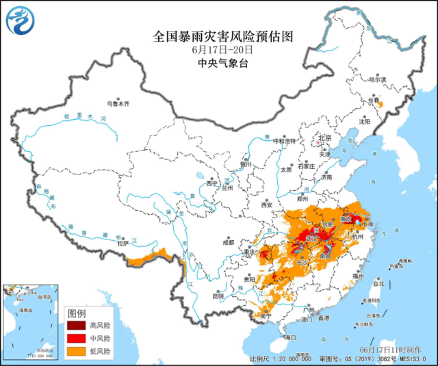 暴雨灾害风险预估:预计17日至20日,长江中下游地区降雨对缓解部分地区气象干旱有利,但强降雨集中,旱涝急转风险高,湖北、湖南、安徽、江苏、江西、重庆、贵州、广西等地易发暴雨灾害。