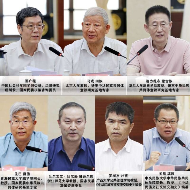 中国社会科学院学部委员邢广程、北京大学教授马戎(回族)、复旦大学教授达力扎布(蒙古族)、青海民族大学教授先巴(藏族)、浙江师范大学教授吐尔文江·吐尔逊(维吾尔族)、广西大学教授罗树杰(壮族)、中央民族大学教授关凯(满族)等7位学者发言,就中华文明五大特性与铸牢中华民族共同体意识、在实事求是基础上坚定中华民族的文化自信、中华文明的统一性与包容性、青藏高原是中国古代文化“场”中重要区域之一、建设中华民族现代文明与中华民族共同体是“文化润疆”的重要方向、壮族文化的形成发展是中华文明五大特性的生动体现、中华民族现代文明与中华民族共同体建设等多方面畅谈学习体会。