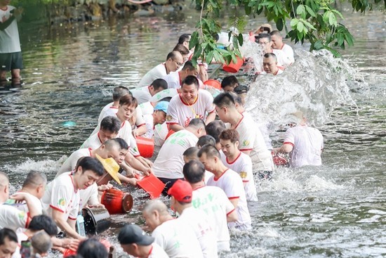 随着船坳里的水逐渐排出,龙船两端慢慢露出水面,露出了狭长的身躯。由于受珠江涨潮影响,排水较慢,临近最后阶段,村民们跳入水中,奋力用铁盆将船身中的泥水舀出。龙船被挖起后,村民们开始冲洗船身内外的污泥、水垢,这只由原枝坤甸红木制作的龙船很快焕然一新。