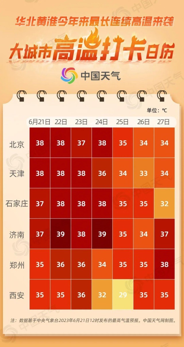 据中国天气网气象分析师张娟介绍,6月21日至28日,华北、黄淮等地将再次出现高温天气,范围和强度接近上次高温过程,且持续时间更长,或将是今年来持续最久的高温过程。
