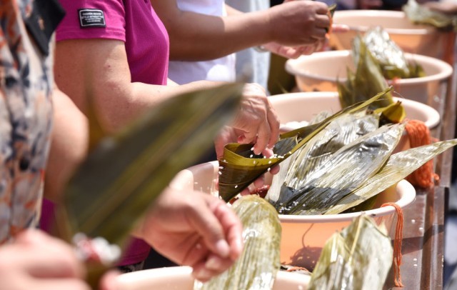 6月18日,在江苏连云港市连云区高公岛凰窝风景区,人们在端午民俗文化活动上参加包粽子比赛。新华社发(王健民 摄)