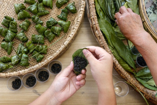 6月14日,在安徽省黄山市祁门县平里镇平里村,茶工把祁门红茶作为“馅料”,用传统包粽子的手法制作“粽茶”。新华社发(施亚磊 摄)