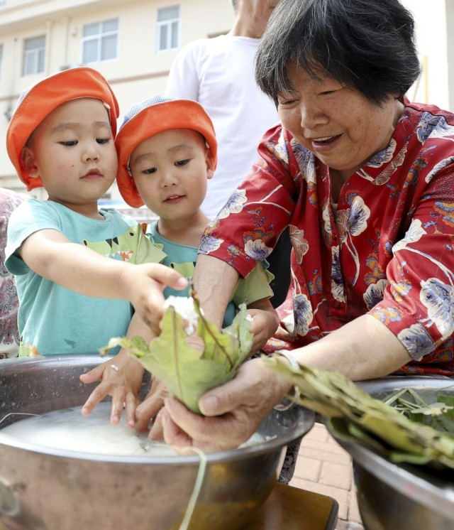 6月20日,山东省滕州市书院小学幼儿园的小朋友学习包粽子。新华社发(宋海存 摄)