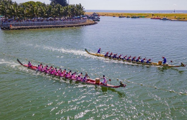 6月22日,海南省琼海市博鳌水域龙舟赛在紧张进行(无人机照片) 。新华社发(蒙钟德摄)