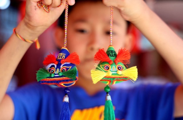6月22日,在山东省滨州市无棣县古城风景区,小朋友展示选购的香囊。新华社发(初宝瑞 摄)