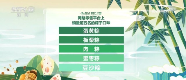 数据显示,2023年6月以来,网络零售平台上销量前五名的粽子口味依次是:蛋黄粽、板栗粽、肉粽、蜜枣粽、豆沙粽。