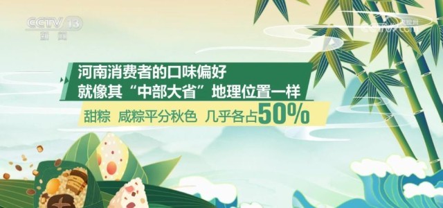 以蜜枣粽、豆沙粽为代表的“甜粽”受到山东、陕西、辽宁、安徽等地消费者偏爱,而以蛋黄、鲜肉为代表的“咸粽”成为广东、浙江、江苏、四川等地消费主流,河南消费者的口味偏好就像其“中部大省”地理位置一样,甜粽、咸粽平分秋色,几乎各占50%。