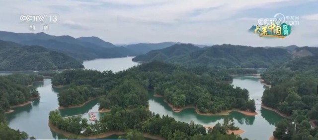 这里是江西阳明湖国家森林公园,碧绿的湖面上倒映着蓝天白云、绿树青山,构成一幅美妙的自然山水画卷。园区内湖湾数量众多,形态各异,犹如镶嵌在茫茫林海中的翡翠玛瑙。