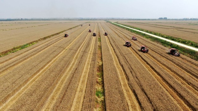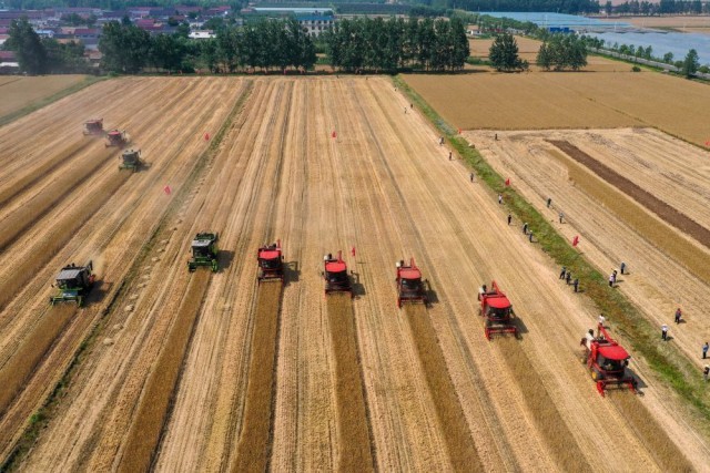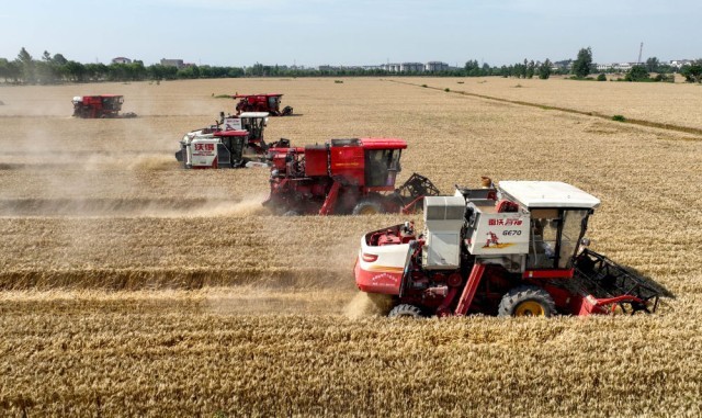 抢收压力较大的安徽从山东、江苏等地引入机具,“歇人不歇机”24小时抢收;由村干部、老党员组成的应急抢收服务队活跃在麦收一线,机动调配农机保障及时抢收。麦收高峰期,安徽日均投入收割机超过12万台,其中6月3日收获小麦997万亩,创历史新高。