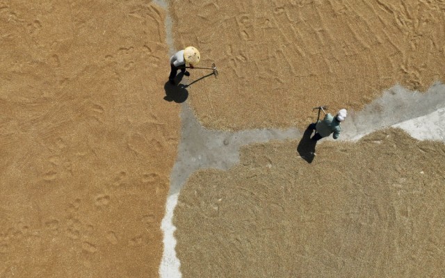 6月15日,在山东省淄博市农邦邦粮食烘干收储服务有限公司的晒场上,工人晾晒粮食。新华社记者 陈灏 摄