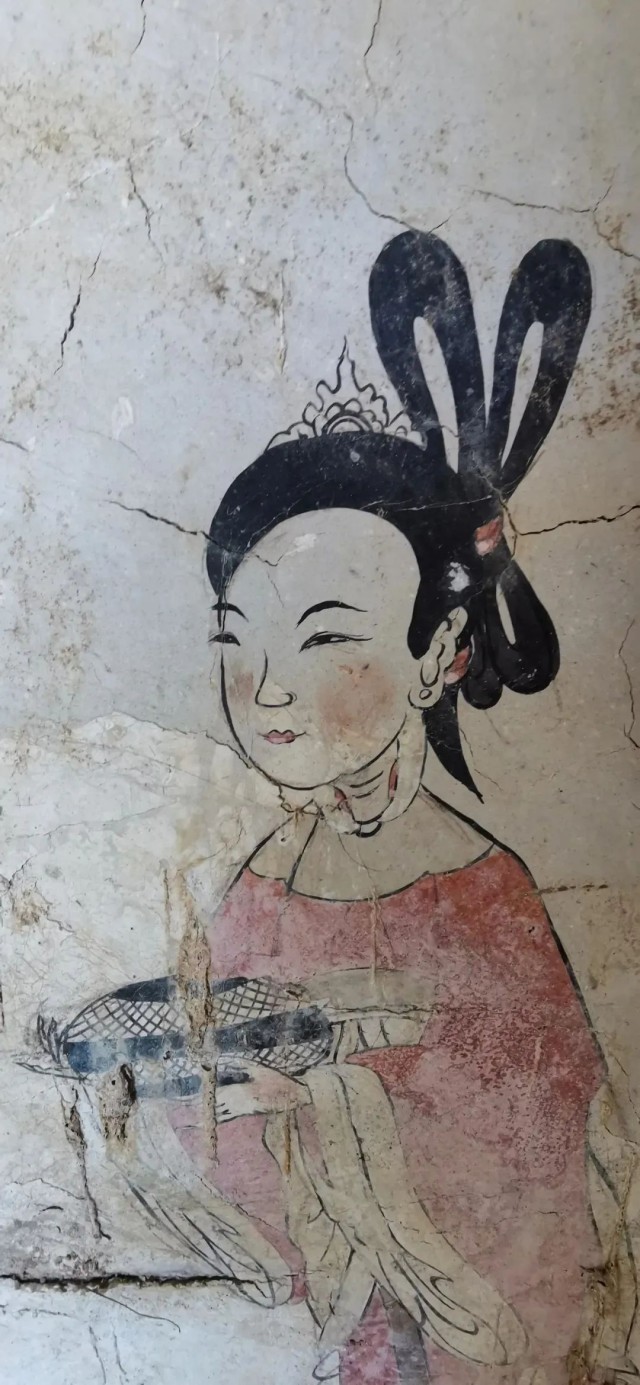 两旁侍女高发髻,躬身双手托盘