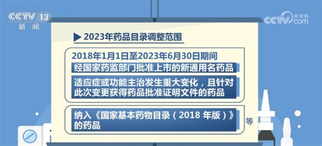 2023年药品目录调整范围为2018年1月1日至2023年6月30日期间,经国家药监部门批准上市的新通用名药品,适应症或功能主治发生重大变化,且针对此次变更获得药品批准证明文件的药品,和纳入《国家基本药物目录(2018年版)》的药品等。
