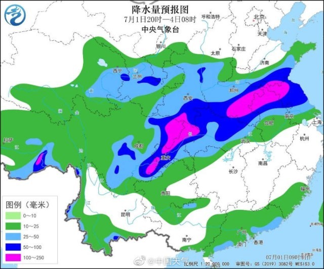 预计7月1日夜间至3日,陕甘南部、四川盆地、黄淮、江汉、江淮等地有强降雨过程,其中陕西南部、四川东部、重庆、湖北北部、河南南部、山东南部、苏皖北部等地将有暴雨或大暴雨,并伴有雷暴大风等强对流天气。