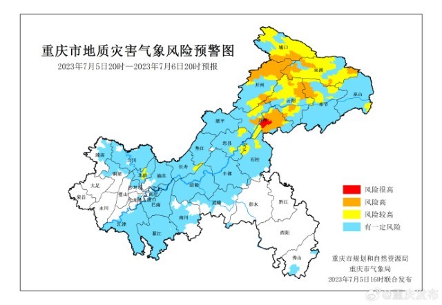 央视网消息:据@重庆发布 微博消息,7月5日16时,重庆市规划和自然资源局、重庆市气象局联合发布全市地质灾害气象风险预警。