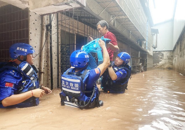 7月4日,蓝天救援队队员在重庆市万州区五桥街道转移被困群众。新华社发(冯涛 摄)