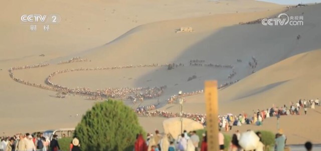 总台记者 张磊:我现在所在的位置是敦煌的鸣沙山月牙泉景区。随着暑期到来,当地的旅游人数也在不断攀升。大家可以在我身后看到,游客现在正在骑着骆驼沿着鸣沙山脚下不断蜿蜒穿行,场面显得十分壮观。以前,只有在小长假期间才会出现的“堵骆驼”的现象,这两天已经成为常态。