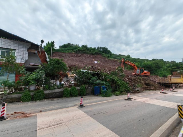 在响滩社区一处公路旁,山体垮塌导致半边公路被埋,一栋农房损毁,挖掘机正在紧张作业恢复交通。如果不是周万忠及时喊出这栋农房里的一家5口,后果不堪设想。