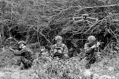 武警广西总队2023年度特战侦察专业展开集训,图为特战队员利用无人机侦察现地环境。奎子清摄/光明图片