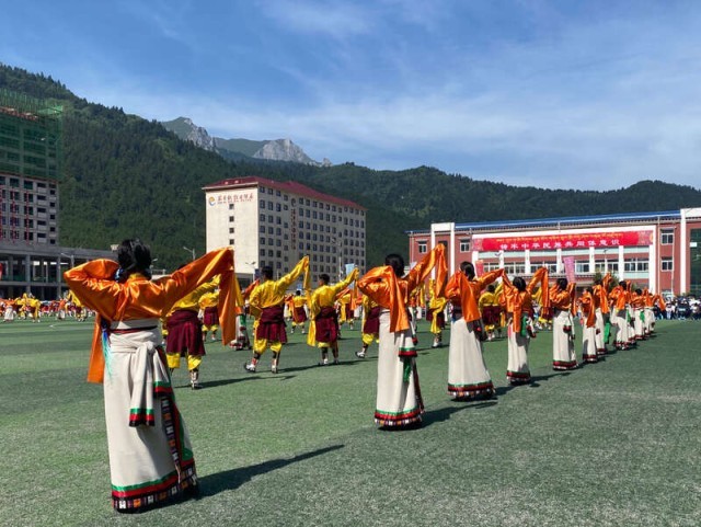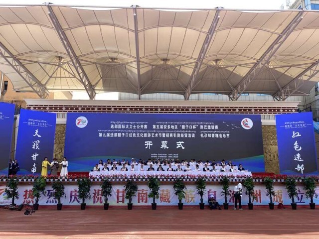 中国青年报客户端讯(中青报·中青网记者马富春 通讯员 陈嘉欣)7月10日,甘肃迭部举办庆祝甘南藏族自治州成立70周年迭部县系列活动开幕式。活动包括 2023年迭部国际大力士公开赛、第五届安多地区“腊子口杯”则巴邀请赛、第九届迭部腊子口红色文化旅游艺术节暨招商引资经贸洽谈会、扎尕那青稞音乐节。
