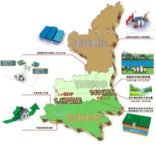 引汉济渭水利工程跨越黄河、长江两大流域。工程建成后,年均调水规模可达15亿立方米,满足西安、咸阳等城市用水,惠及人口超过1411万,可支撑受水区内1.1万亿元GDP,新增500万人口规模的城市用水。