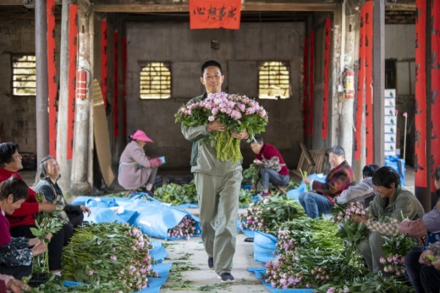 今年春天,浦江县杭坪镇乌浆村,薛勇带着村民整理包装采摘的芍药花,“鲜花经济”带动村民共同奔富。共享联盟·金华中心 胡肖飞 摄